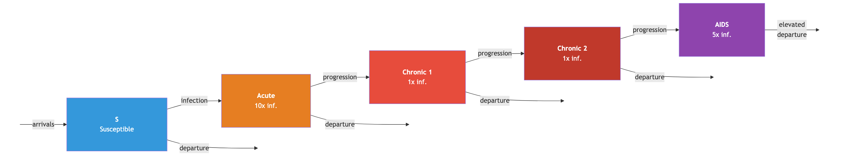Simplified HIV transmission with four infectious stages (Acute, Chronic 1-2, AIDS) and antiretroviral therapy intervention based on Granich et al.