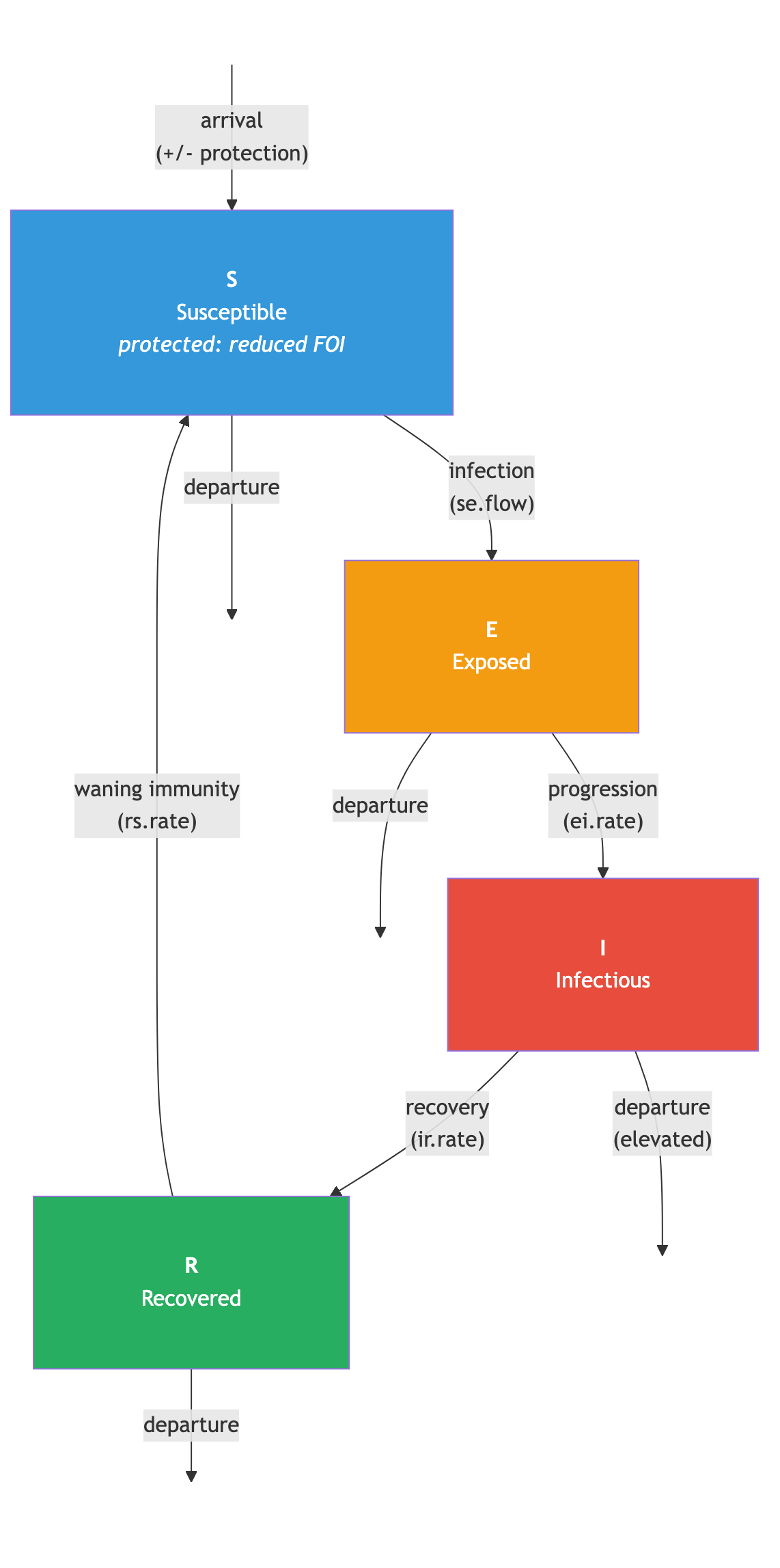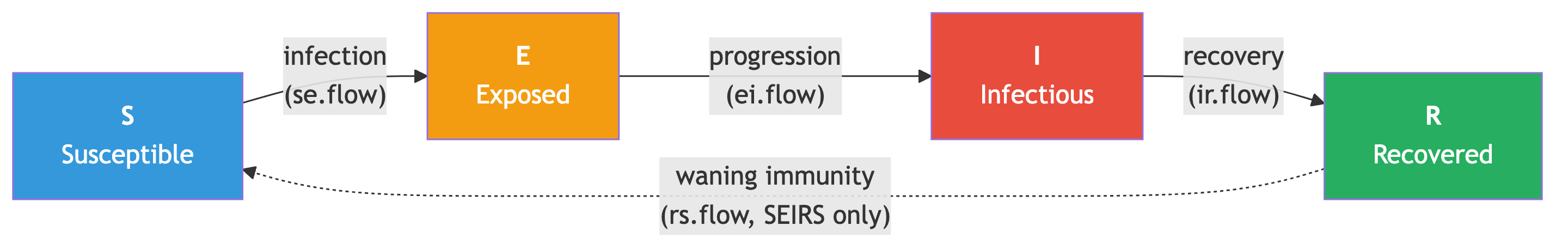 Extend EpiModel’s SIR by adding a latent Exposed compartment, with an SEIRS waning-immunity extension.