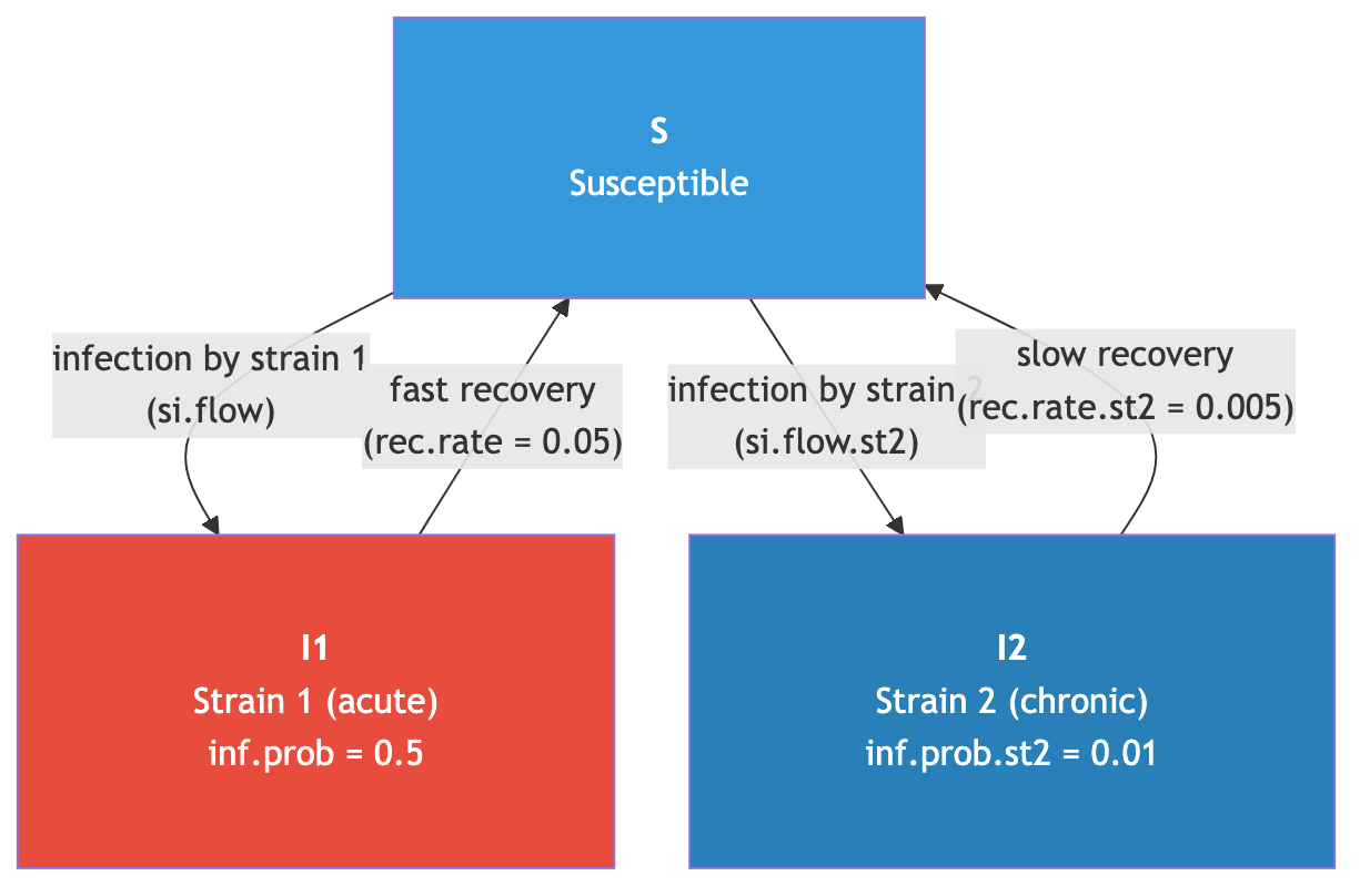 Models SIS with two competing strains differing in transmission-duration trade-offs, showing how network concurrency determines which strain dominates.