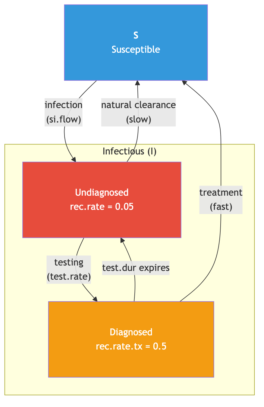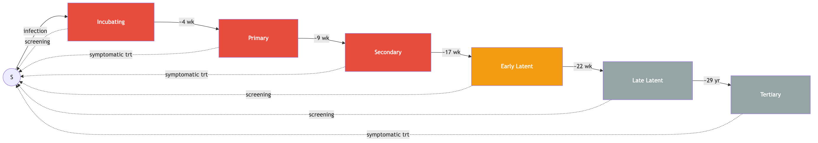 Models multi-stage syphilis transmission, progression, diagnosis, and treatment with stage-dependent infectiousness and screening-driven recovery.