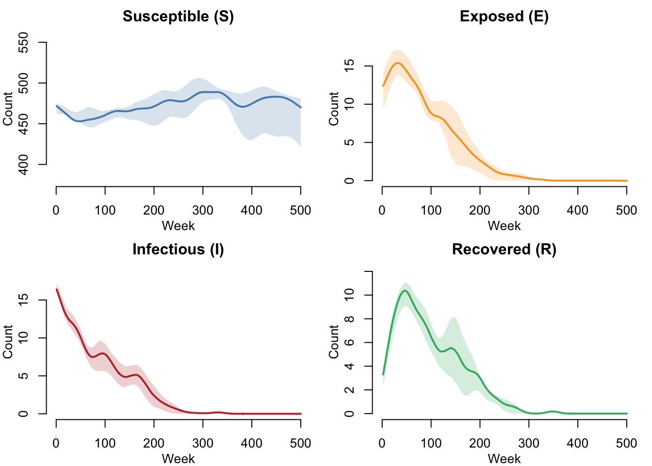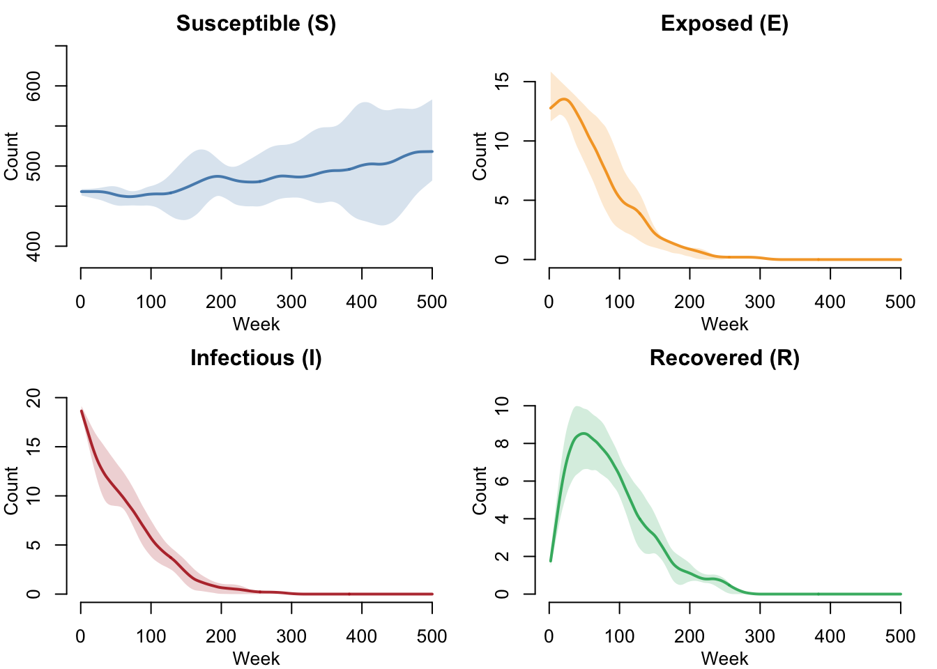 main = "Exposed (E)", ylab = "Count", xlab = "Week",