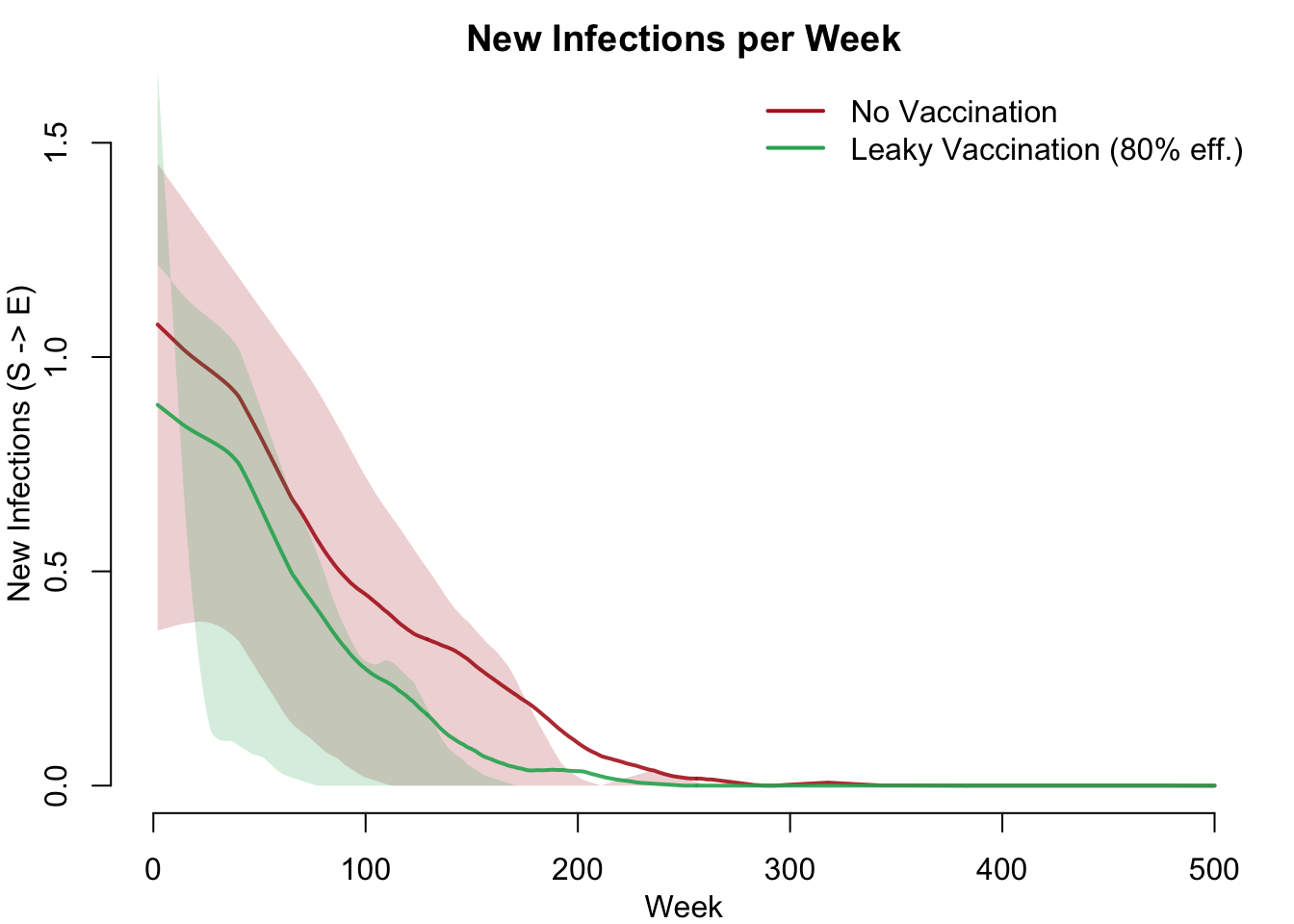 Figure 6: Weekly new infections (S to E transitions) comparing no vaccination (red) with leaky vaccination (green).