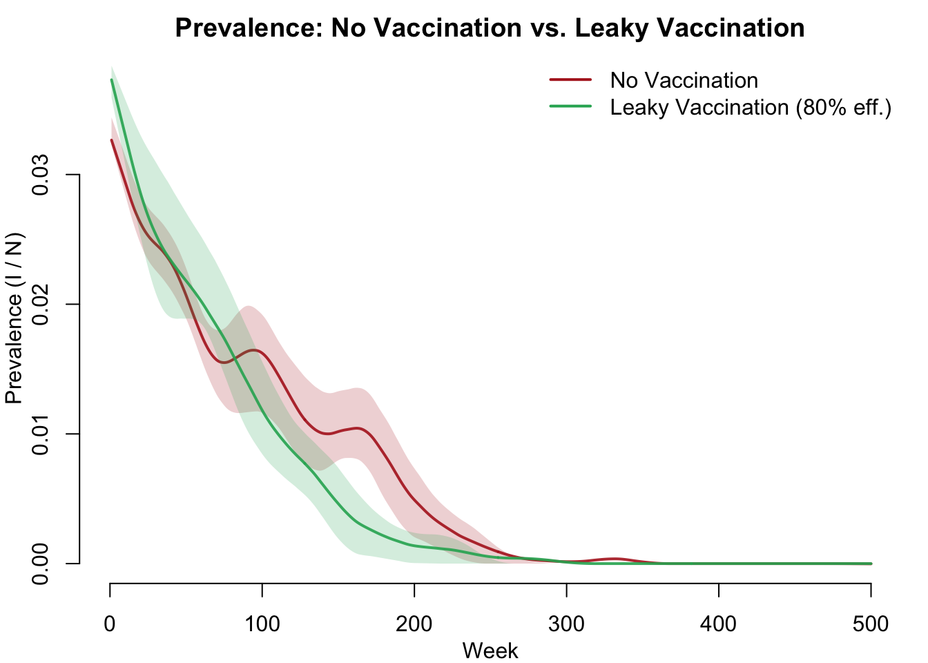 Leaky vaccines are the more realistic model for many real-world vaccines (e.g., influenza, pertussis, COVID-19) where protection reduces the likelihood of infection but does not eliminate it. The key parameter is vaccine.efficacy (\(\psi\)): a protected individual’s transmission probability is reduced to \((1 - \psi) \times\) inf.prob. With 80% efficacy, a protected individual faces only 20% of the baseline transmission risk per act.