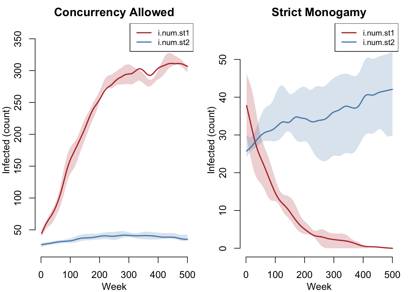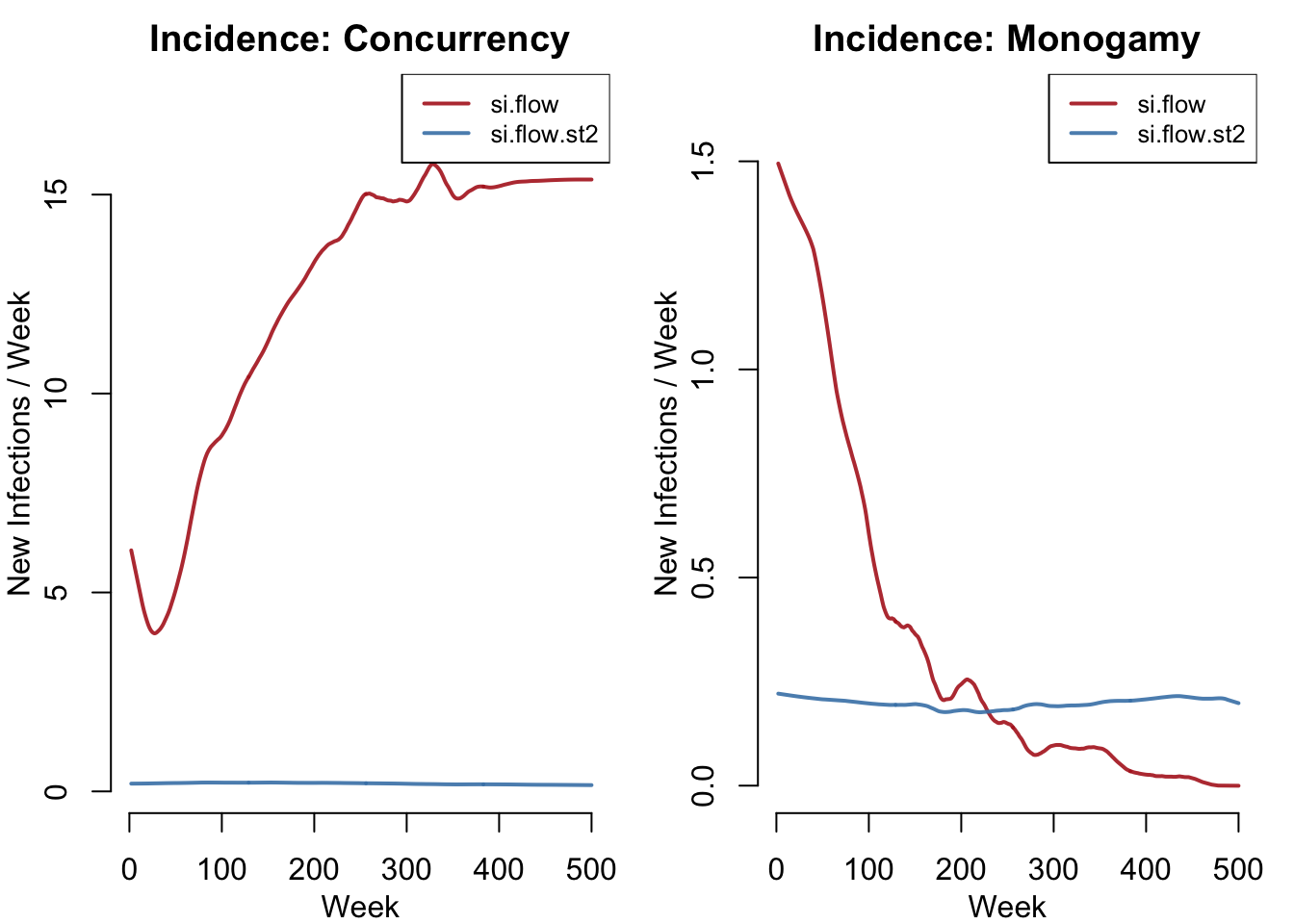 Figure 5: Weekly new infections by strain. Left: with concurrency, strain 1 generates far more new infections. Right: under monogamy, strain 2 produces a steady trickle while strain 1 fades.