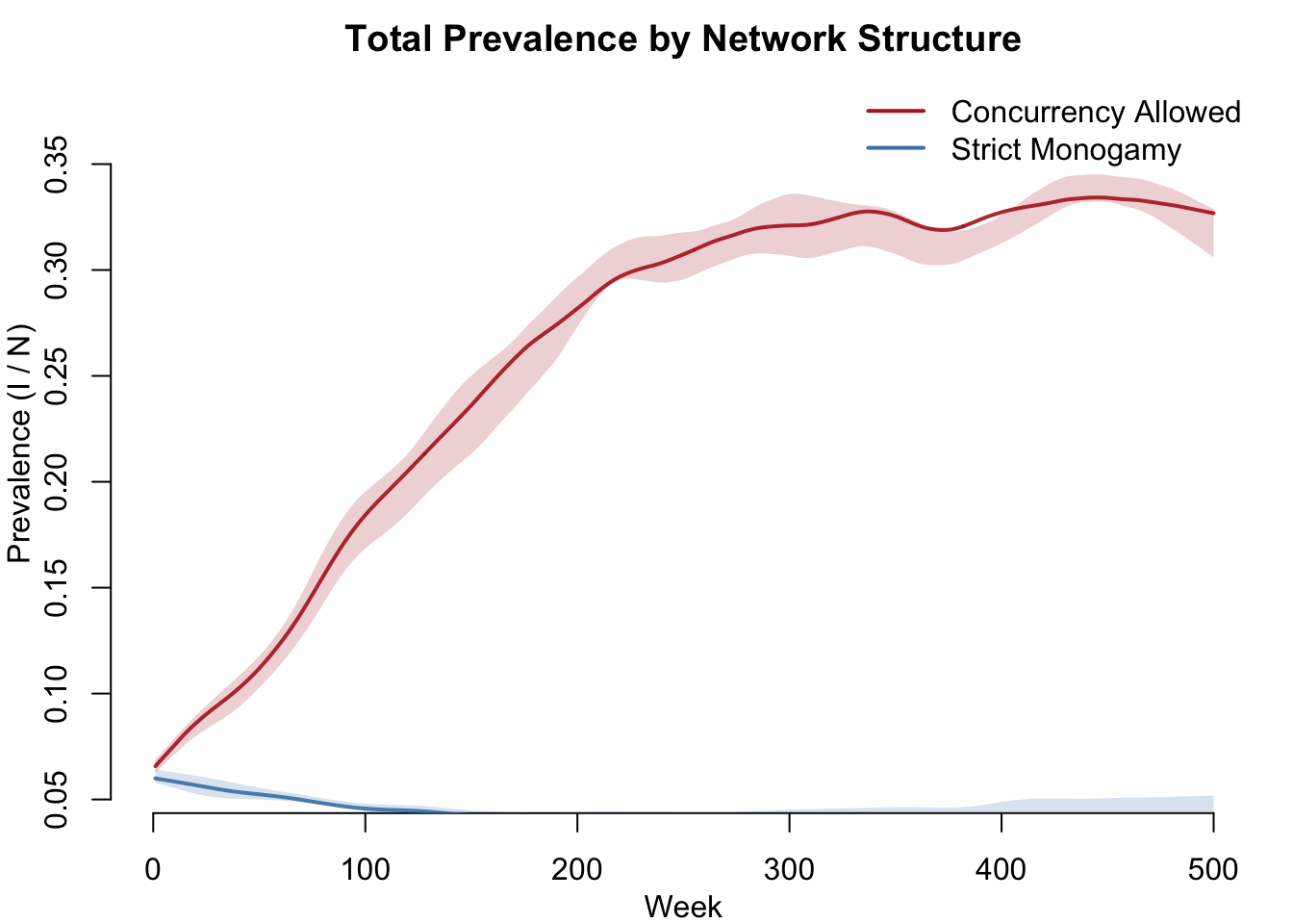 The central question: which transmission strategy wins? The answer depends critically on the network structure — specifically, whether concurrency (simultaneous partnerships) is allowed. Concurrency amplifies transmission by allowing an infected individual to spread the pathogen to a new partner before the existing partnership ends, creating branching chains of transmission. This benefits the fast-spreading acute strain disproportionately.
